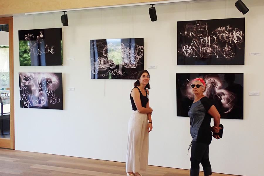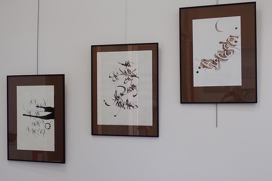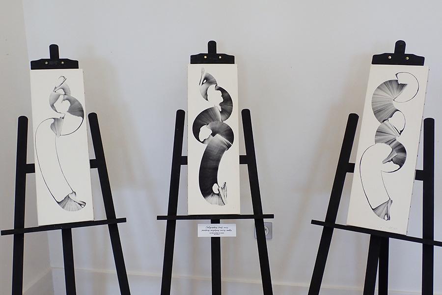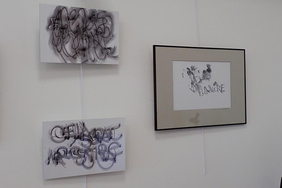 Encres sur papier, traits noirs peintures sur toile, et calligraphies de lumière tirages sur panneaux.
