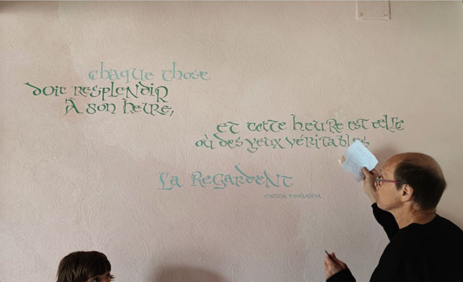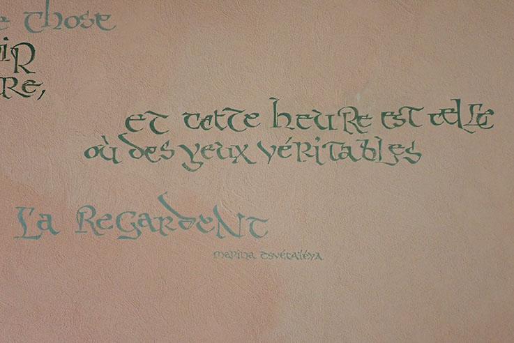 Publié le 27 juillet 202327 juillet 2023 par brunoriboulot Avril 23. Commande pour intérieur de salon. Sur crépi à gros grain, pinceau un peu sec pour laisser voir par transparence du trait, le support. Citation de la poétesse russe Marina Tsvetaïeva Partager : Cliquer pour partager sur X(ouvre dans une nouvelle fenêtre) X Cliquez pour partager sur Facebook(ouvre dans une nouvelle fenêtre) Facebook J’aime chargement… Similaire