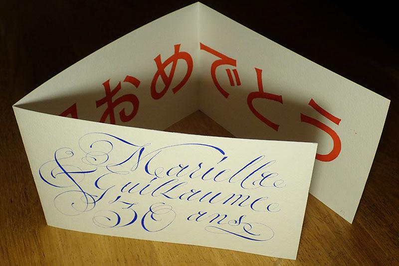 Publié le 18 août 202520 août 2025 par brunoriboulot Carte de félicitations pour obtention de diplôme. Triptyque sur carte, cursive bâtarde et gouache bleue ¶¶¶ ¶¶¶ Carte anniversaire pour amoureux du Japon. Plume pointue et automatic pen, gouaches. ¶¶¶ ¶¶¶ Partager : Cliquer pour partager sur X(ouvre dans une nouvelle fenêtre) X Cliquez pour partager sur Facebook(ouvre dans une nouvelle fenêtre) Facebook J’aime chargement… Similaire