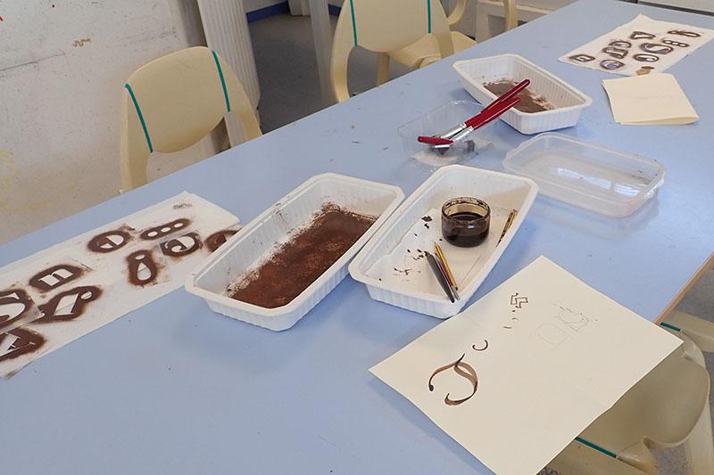 Modèles d’écriture et de pochoirs: gouache fluide s’infiltrant sous masques, encre lino en dégradés de clartés, ou encrage très gras. Les élèves pourront choisir leurs nuances:
