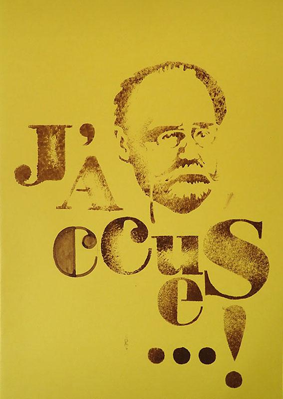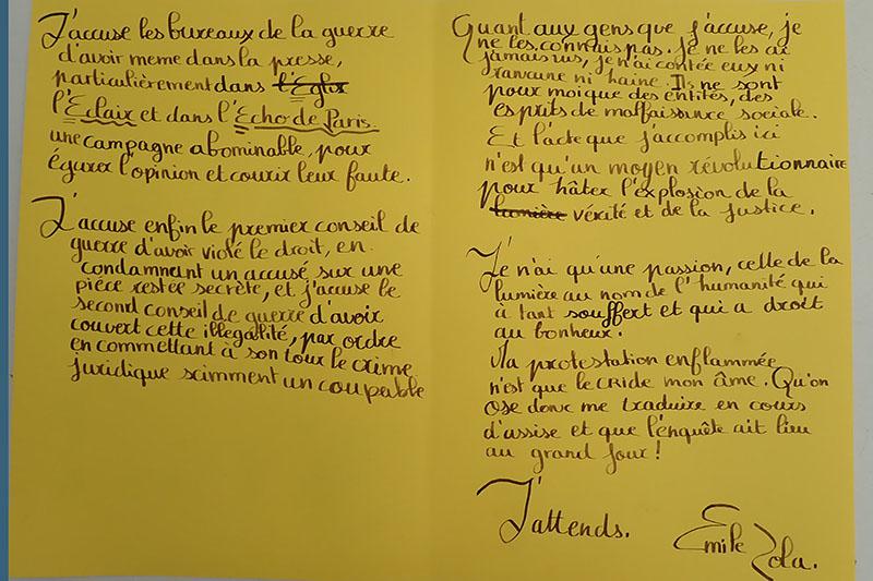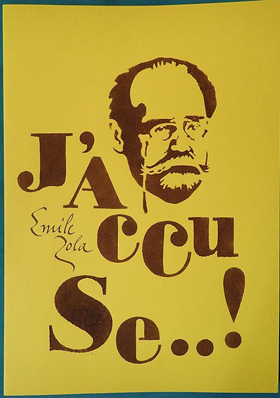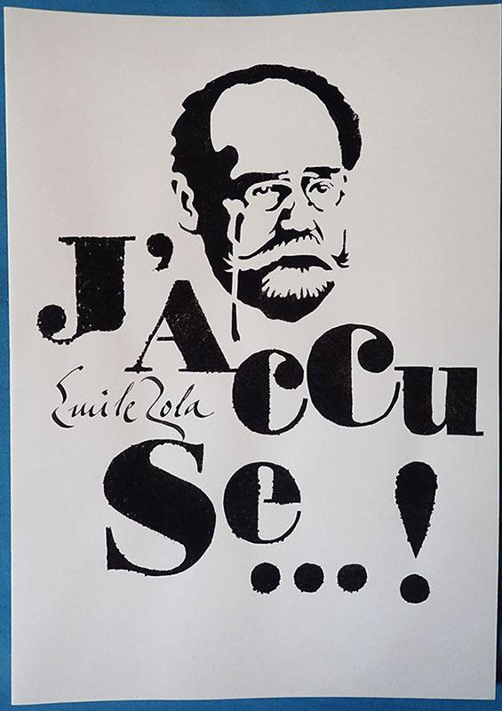 Mai 2024. Intervention en classe de 20 élèves de 4èmes. D’après l’écriture manuscrite de Zola et la typographie Didot gras du titre de l’Aurore. En grande salle avec 3 ateliers tournants: écriture de quelques paragraphes choisis en double page intérieures d’un carnet A4. Puis à tour de rôle, compo de couverture au pochoir pour le portrait de Zola et les lettres. Ceux qui se le sentaient disposaient d’un modèle pour s’essayer à dessiner un des caractères Didot (3 élèves sur les 20 ont tenté!), afin de mieux comprendre leur forme.