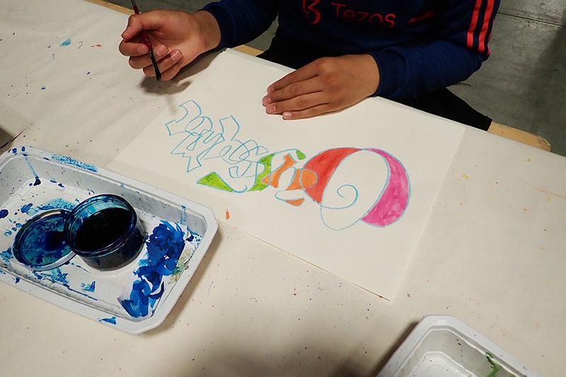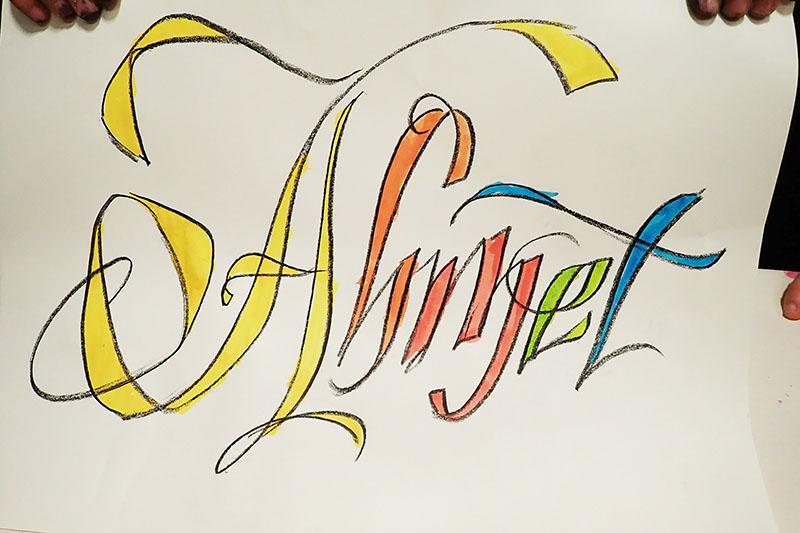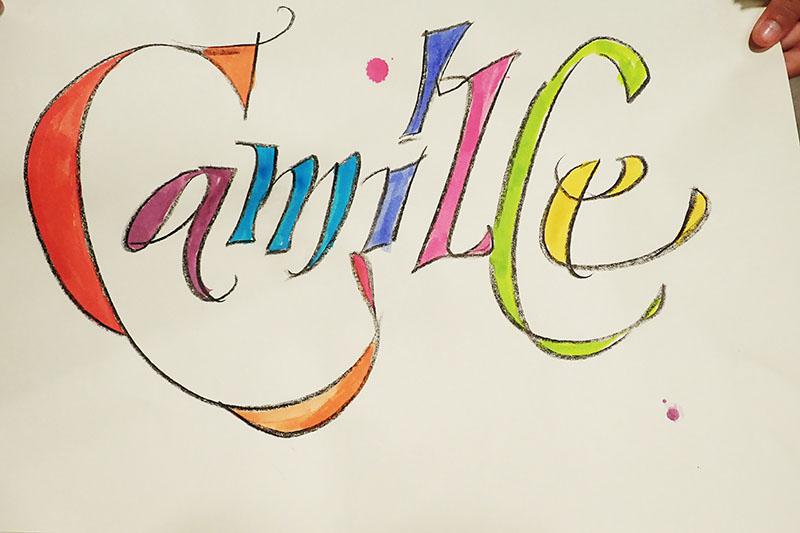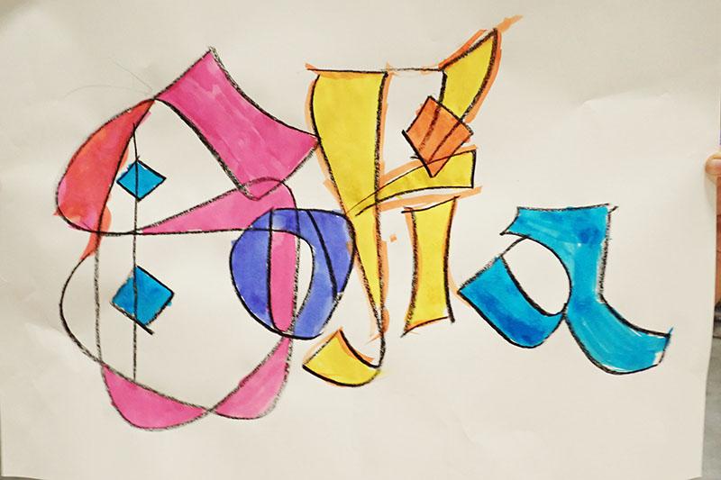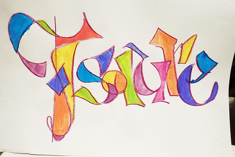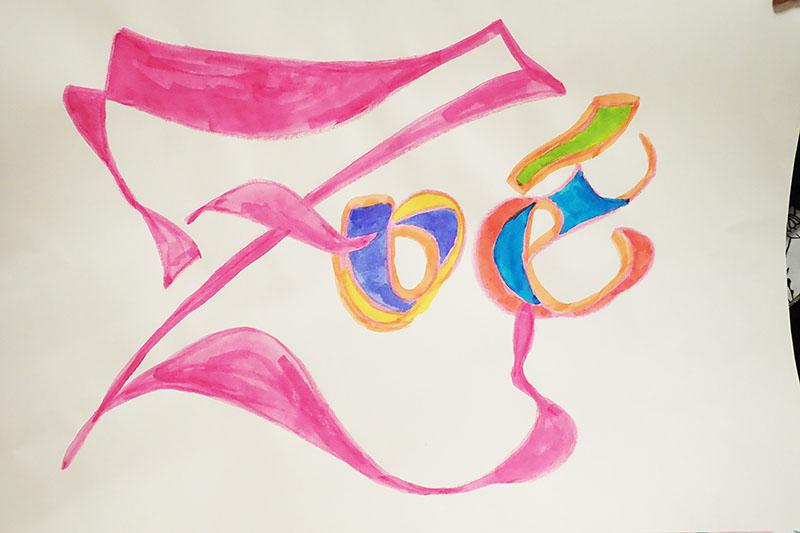 Atelier calligraphie tout public. Thème couleur. Collaboration avec les enfants ou adultes. Je fais rapidement les cloisonnements au double trait gras. Puis les participants mettent en couleur avec des encres à l’eau, formes ou contre – formes.