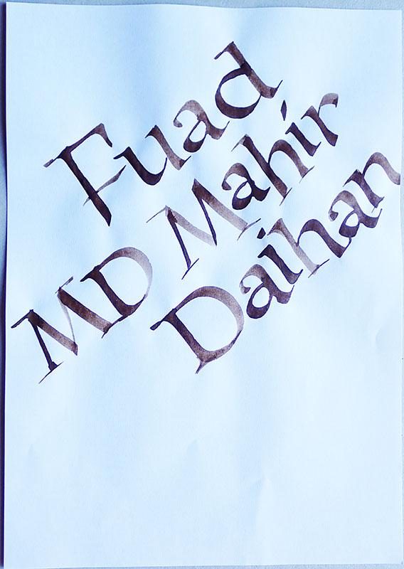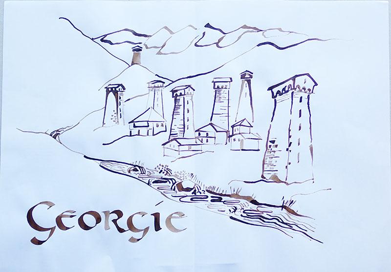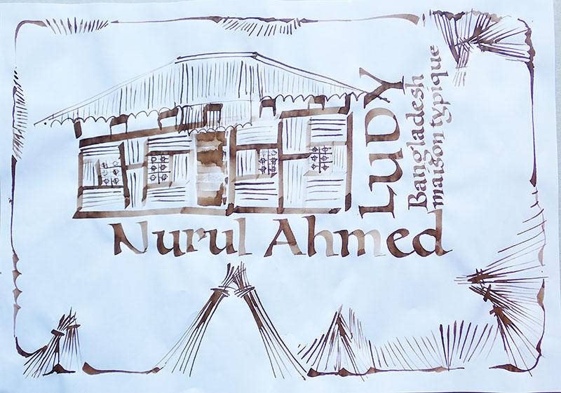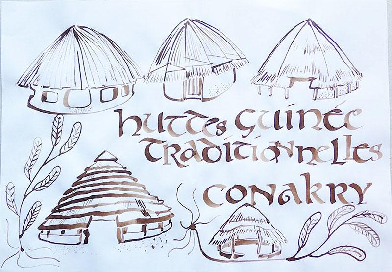 Classes UPE2A à Cahors. Cours de français pour migrants. Certains ayant été alphabétisés dans leur pays d’origine. D’autres non. Proposition en début d’année pour les participants de recueillir un ou deux de leur meilleurs souvenirs de leur pays d’origine. Je prépare pendant l’année un doc de travail lettrage + images, pour chacun des participants. Réalisation finale écriture (3 styles au choix) + dessin, avec ma venue dans la classe en fin d’année. Une classe avec des projets de tous les coins du monde. Carnet avec leur nom écrit en couverture, et double page intérieure, sorte de jardin graphique en composant les objets souvenirs choisis (paysage, monument, détail architectural, plante, animal, aliment, matière, odeur, etc…). Roseau, pinceaux, plumes et encre.