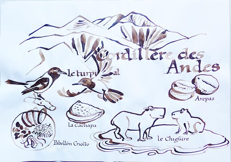 Venezuela, paysage, oiseau, mammifère et divers plats.