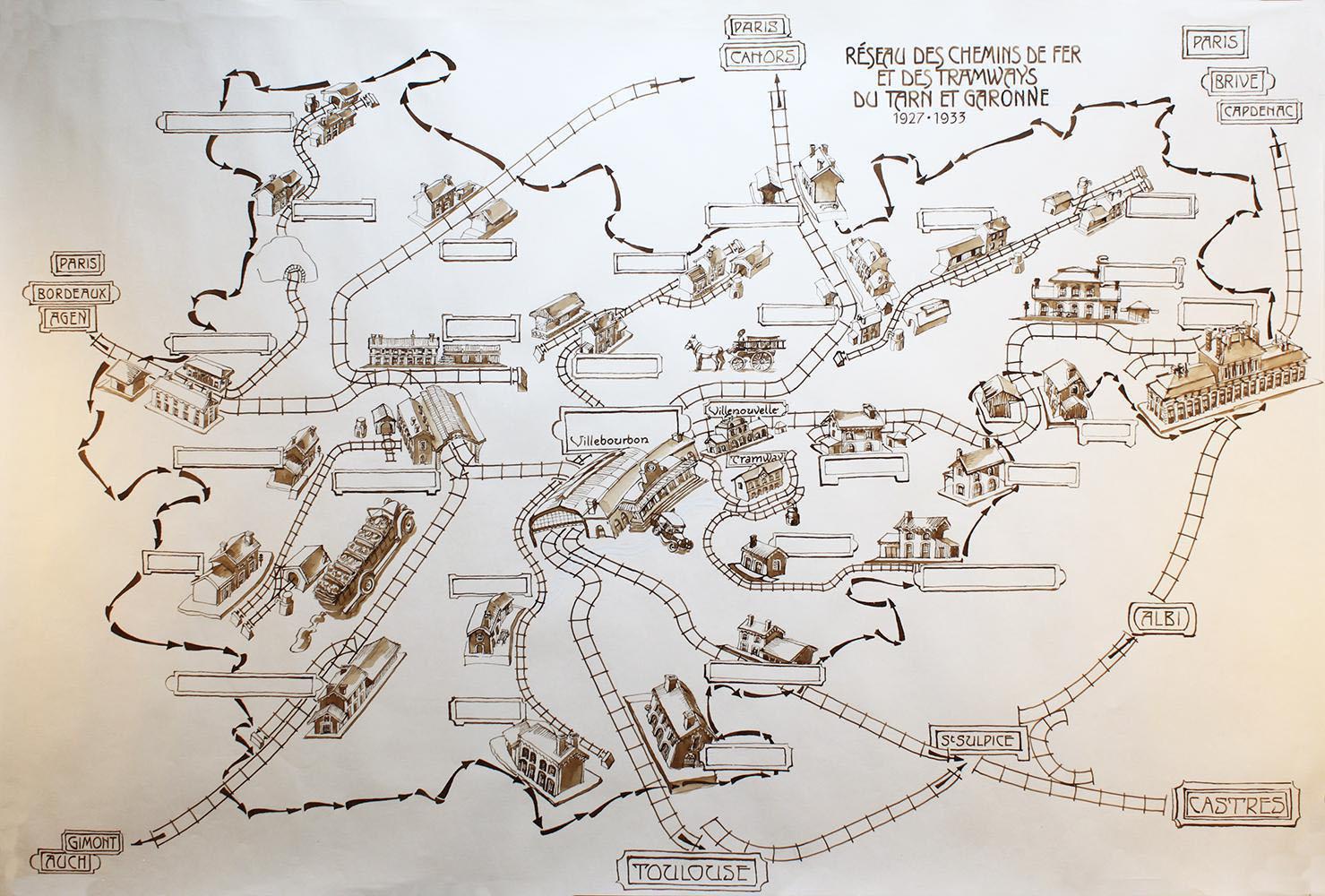 Sur un plateau de jeu 120 x 80 cm représentant les tramways (petits trains à voie étroite) et trains (à voie large) départementaux de l’époque 1918-1933, les participants s’exercent à une forme d’écriture art nouveau et art déco. Puis vont collectivement retrouver les noms de gares manquants et les écrire dans les cartouches de vides. Une carte du département et une carte calligraphique des gares aident à resituer.