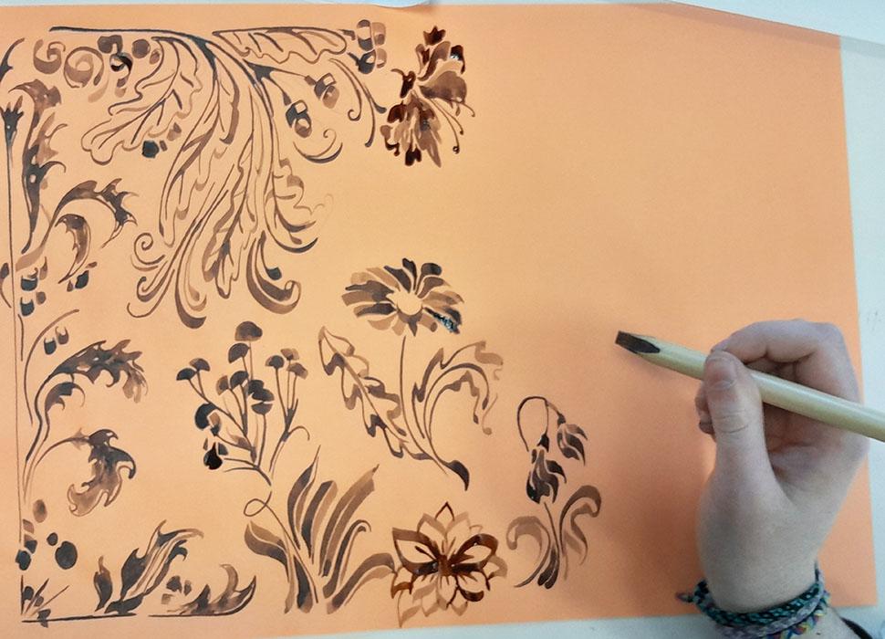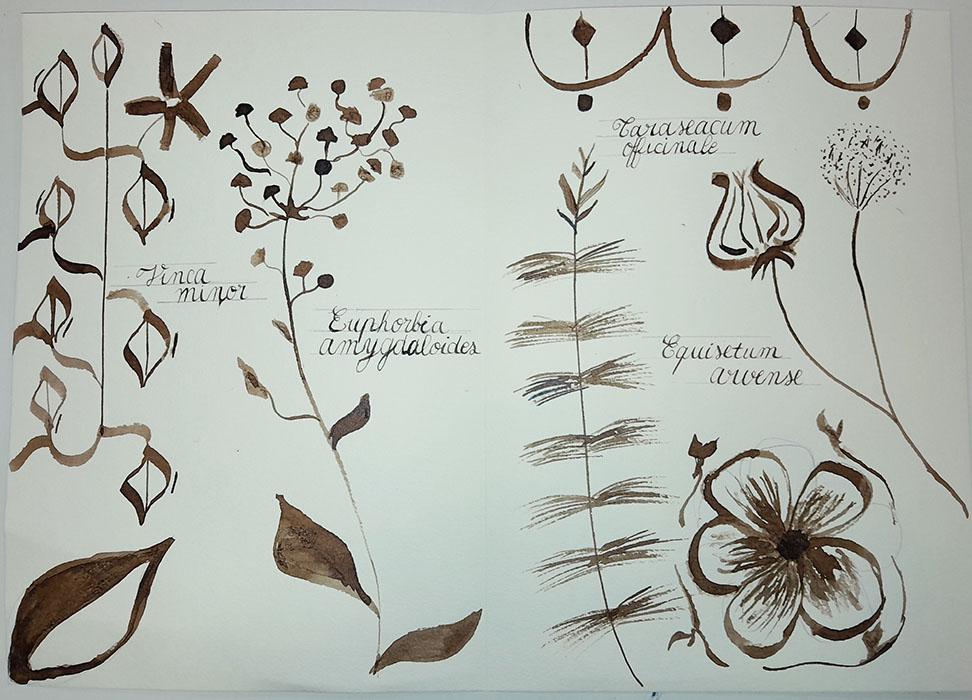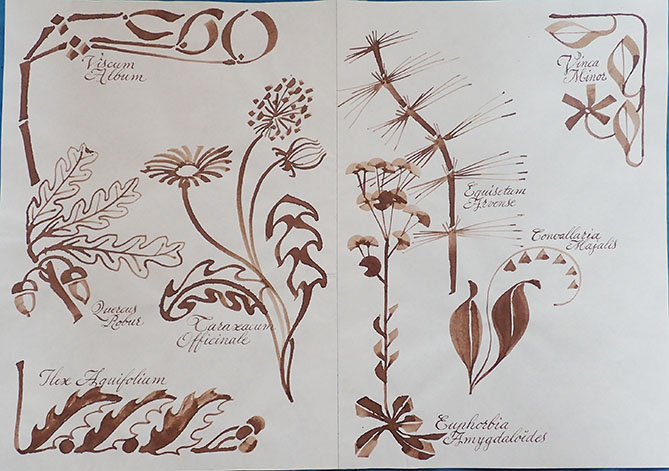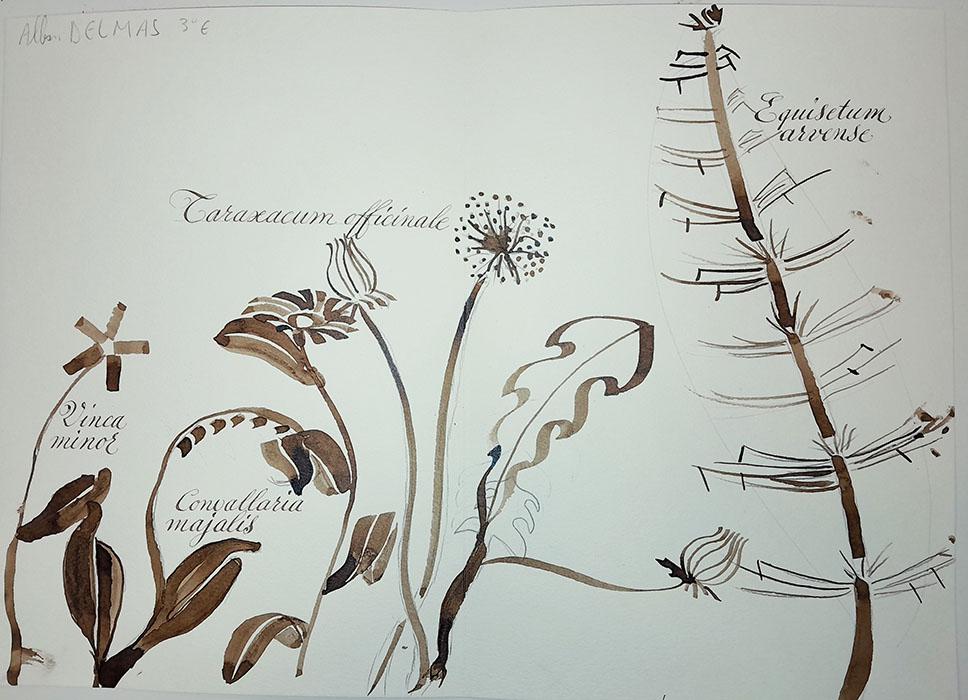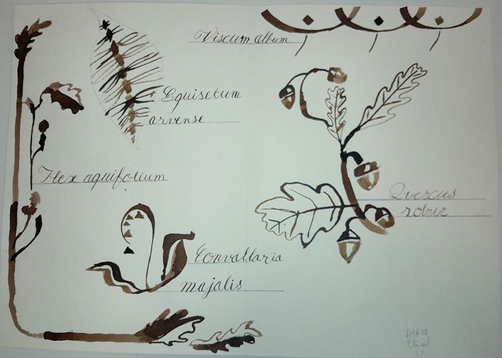 Interventions en mars et avril pour latinistes des collèges de Lafrançaise et Cahors. 4e et 3e. Sur 2 séances. Prise en main du dessin stylisé au roseau et encre. Page de titre en initiation de Quadratta époque romaine. Double dénomination latine des plantes en initiation de style Anglaise, dans le système de Carl von Linné et autres naturalistes qui suivront.