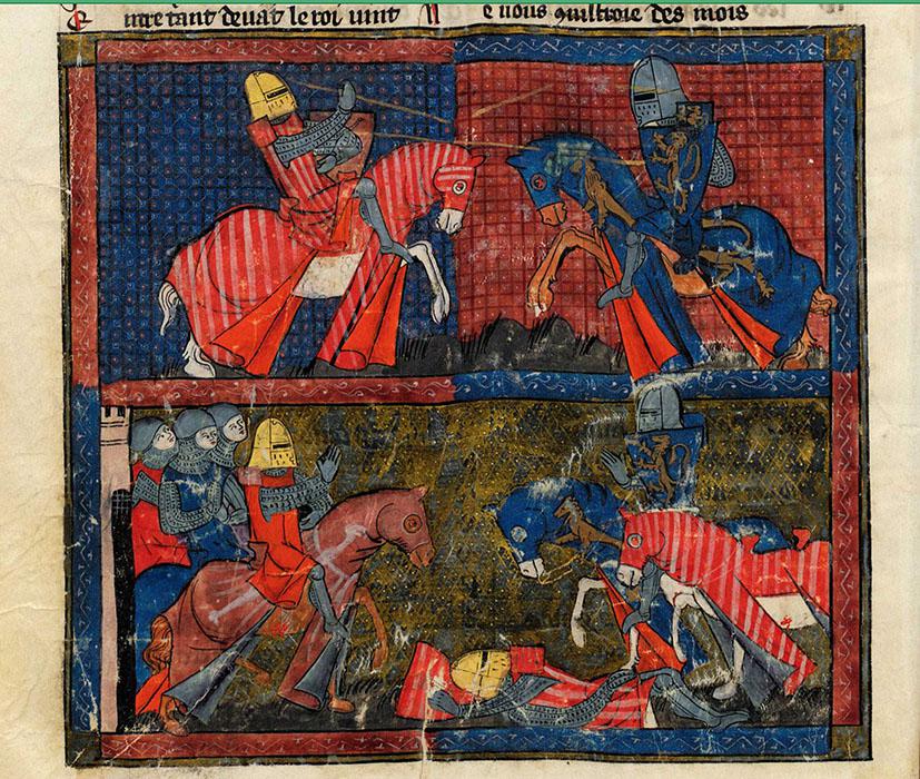 Identification des partis dans la confusion, à l’origine de l’héraldique. À gauche, enluminure de Jean Froissart XIVe montrant les armoiries de chevaliers, bataille de Crécy. À droite miniature XIIIe, épisode d’Yvain ou le chevalier au lion, de Chrétien de Troyes.