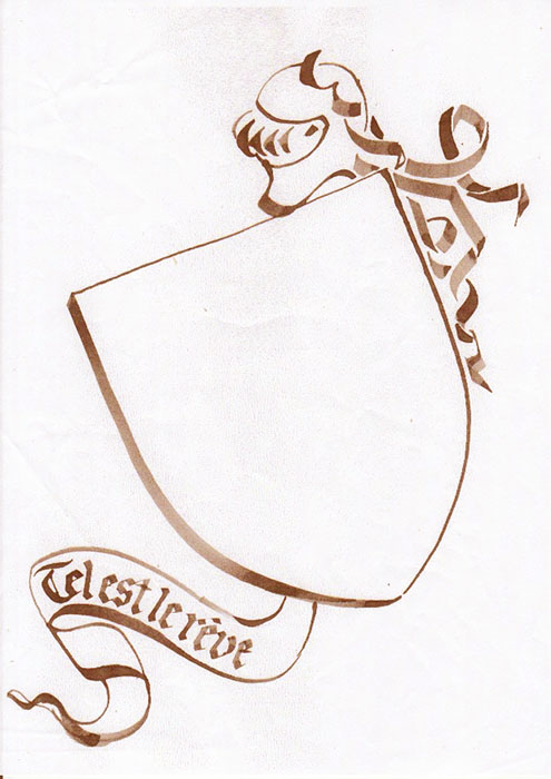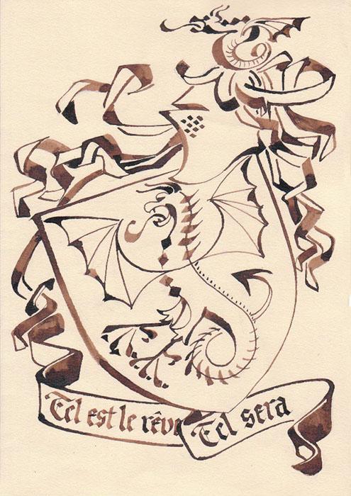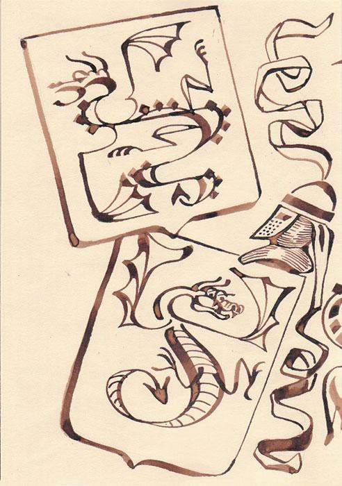 Docs d’exemples. De gauche à droite: armoiries complexes, écu + timbre + motif héraldique dragon + devise. Armoiries plus sobres, timbre simplifié + devise.